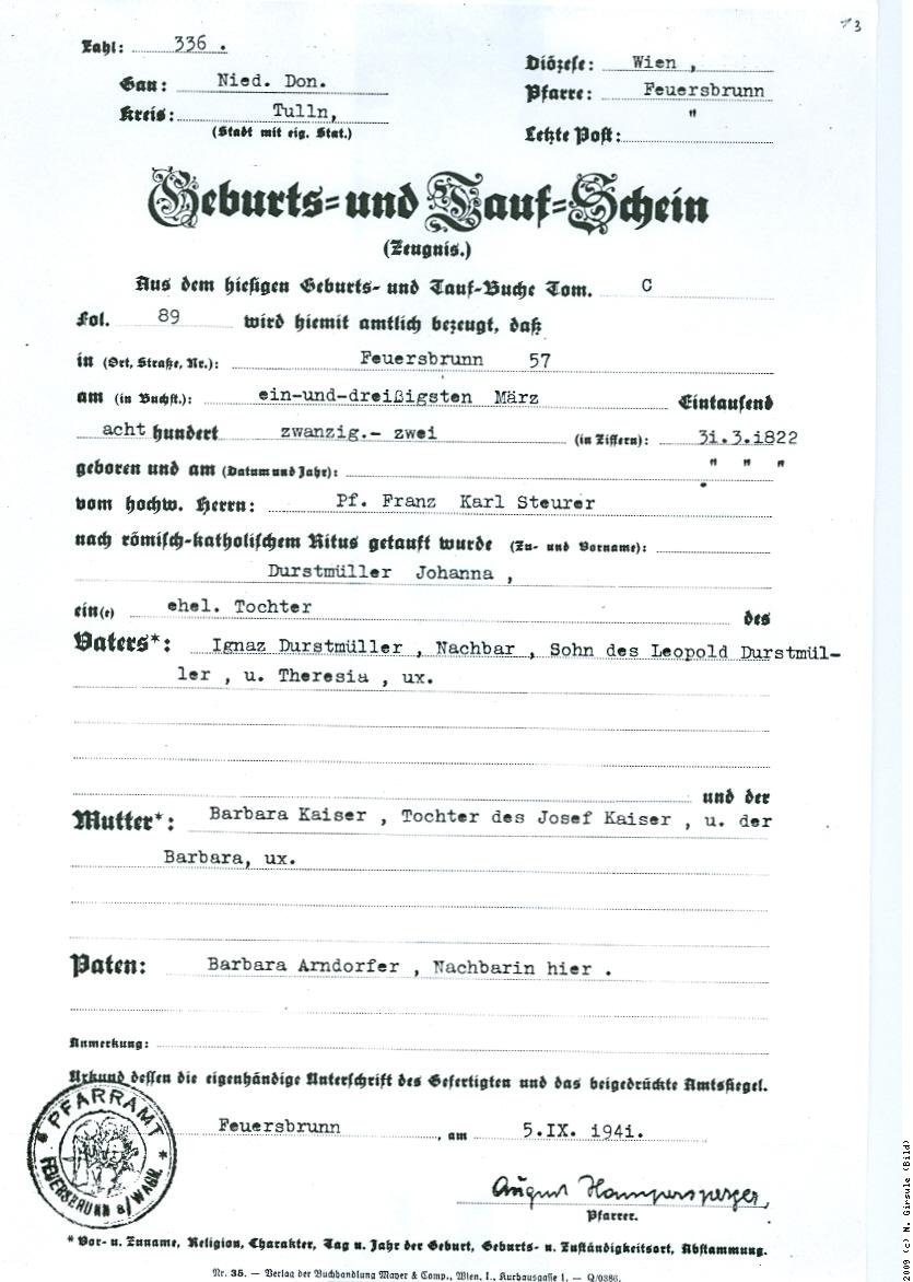 1822-03-31 * Johanna Wallner 1822, Feuersbrunn 57