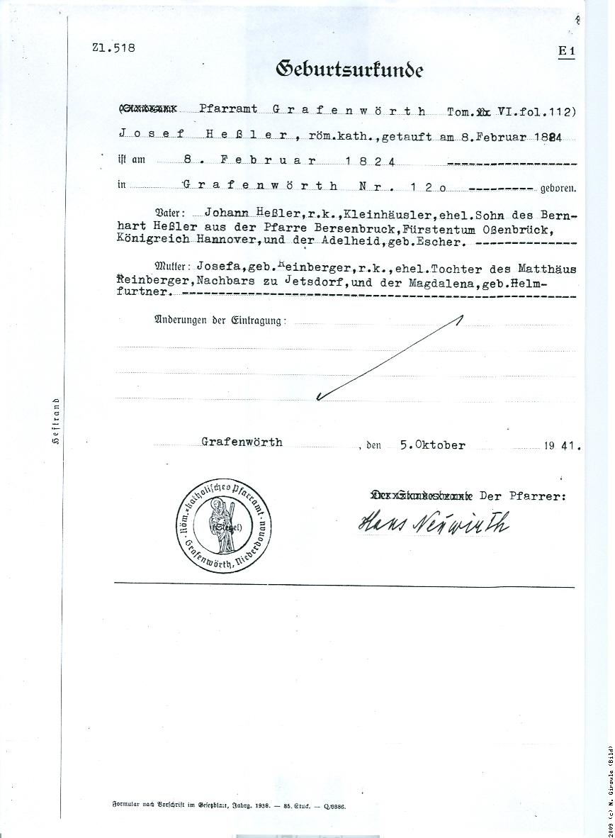 Vater: Johann Heßler, r.k., Kleinhäusler, ehel. Sohn des Bernhart Heßler aus der Pfarre Bersenbruck, Fürstentum Oßenbrück, Königreich Hannover, und der Adelheid, geb. Escher.